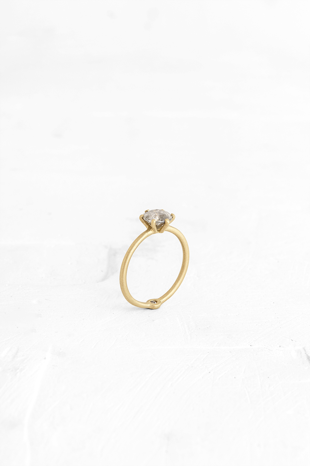 A thin, hoop ring with a setting for a stone or a diamond. The gem shines in its full glory, exposed from all sides and glittering. Set on the inside of the ring there is a small hidden stone which adds a shining colorful dot. It is there solely for the pleasure of the ring wearer, a guiding light, reflecting on the “star” of the show.