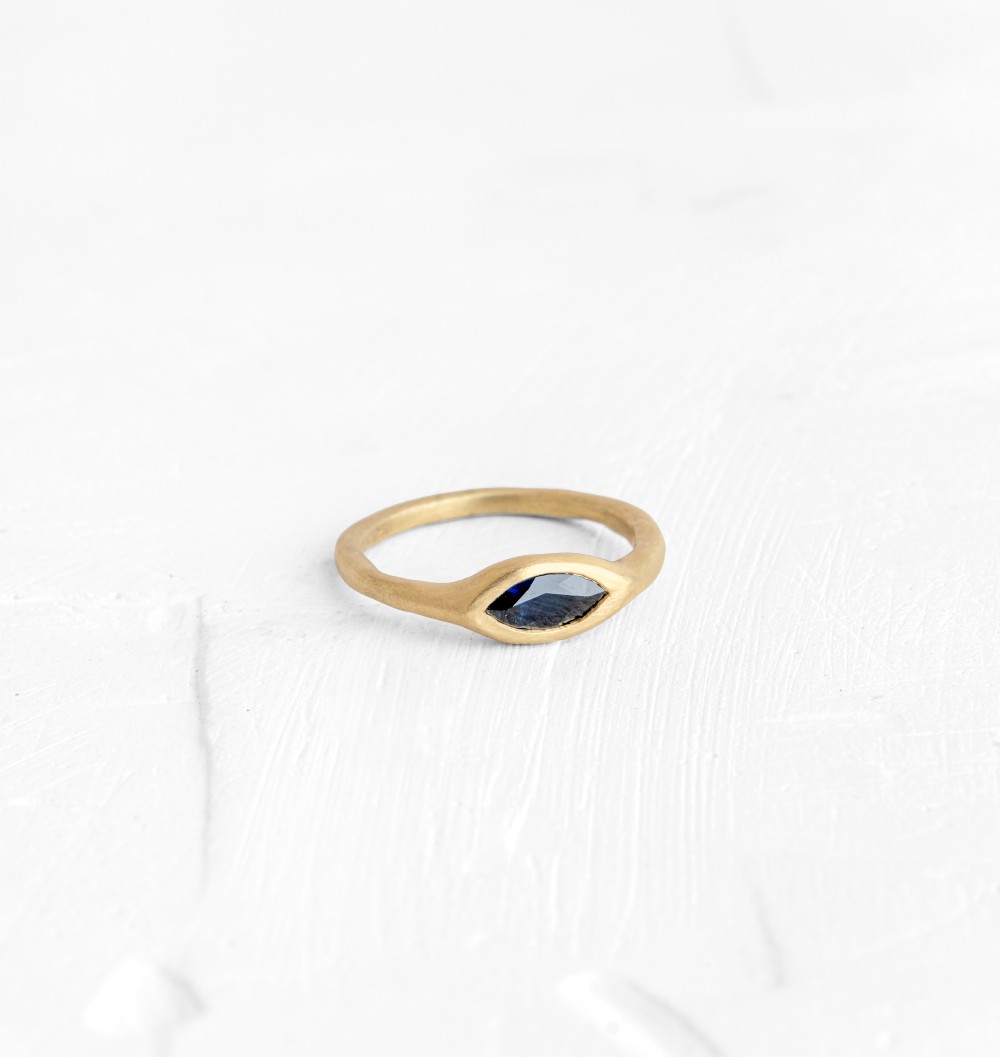 A gold ring is set with a stunning 0.50 ct. marquise cut blue Sapphire stone.